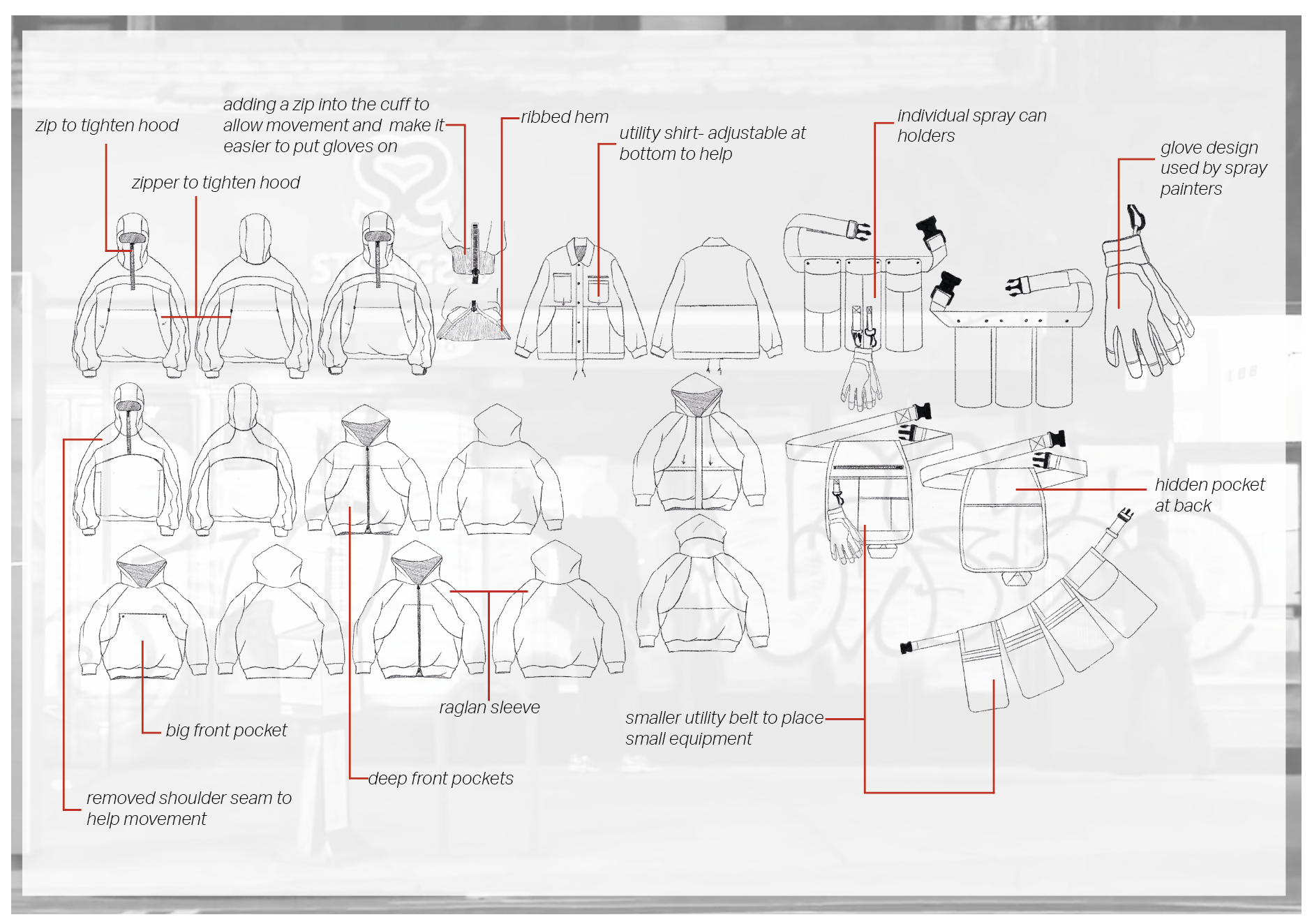 Here I have designed a collection to benefit and aid graffiti artist. Inspired by a graffiti site in New York called ‘5-Pointz’, that got destroyed by developers leading to a legal battle and debate the cultural significance of street art.